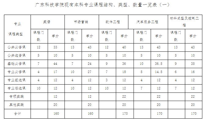 广东科技学院现有本科专业课程结构、类型、数量一览表(四)